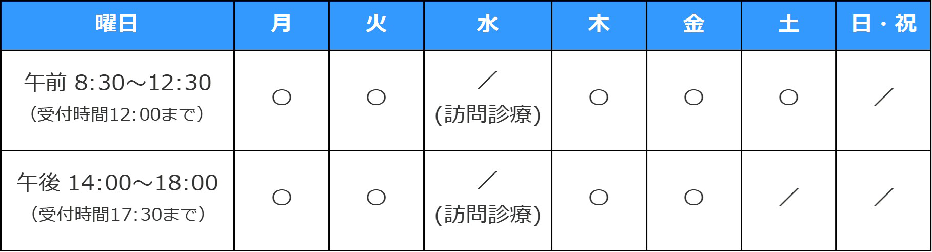 | 午前 8:30〜12:30 (受付時間12:00まで) |