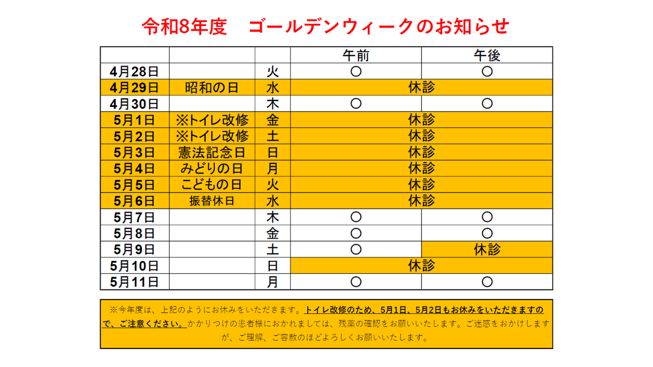 車いすの方も利用できるようにトイレの改修を行うため、5月に長めの連休をいただいております。